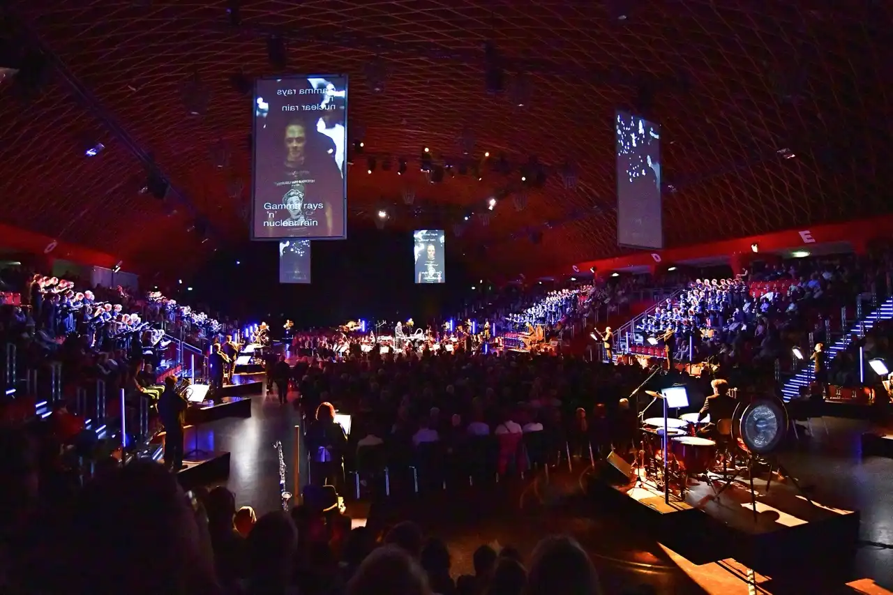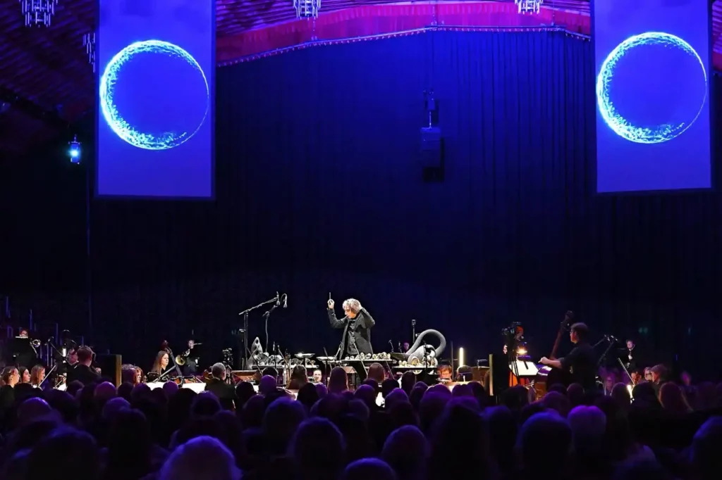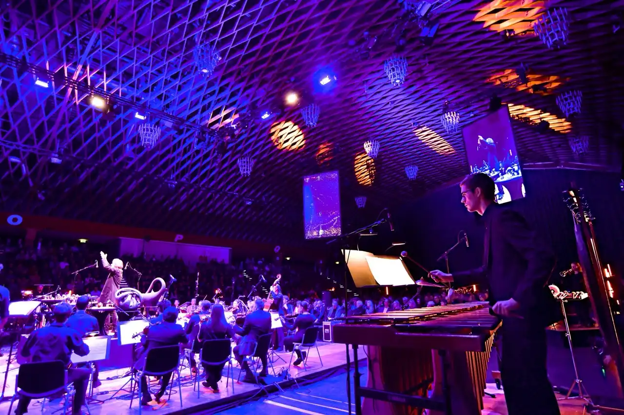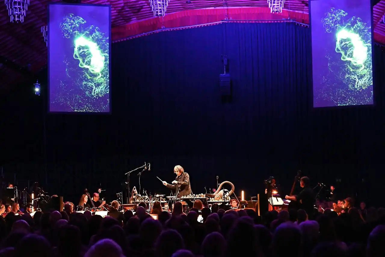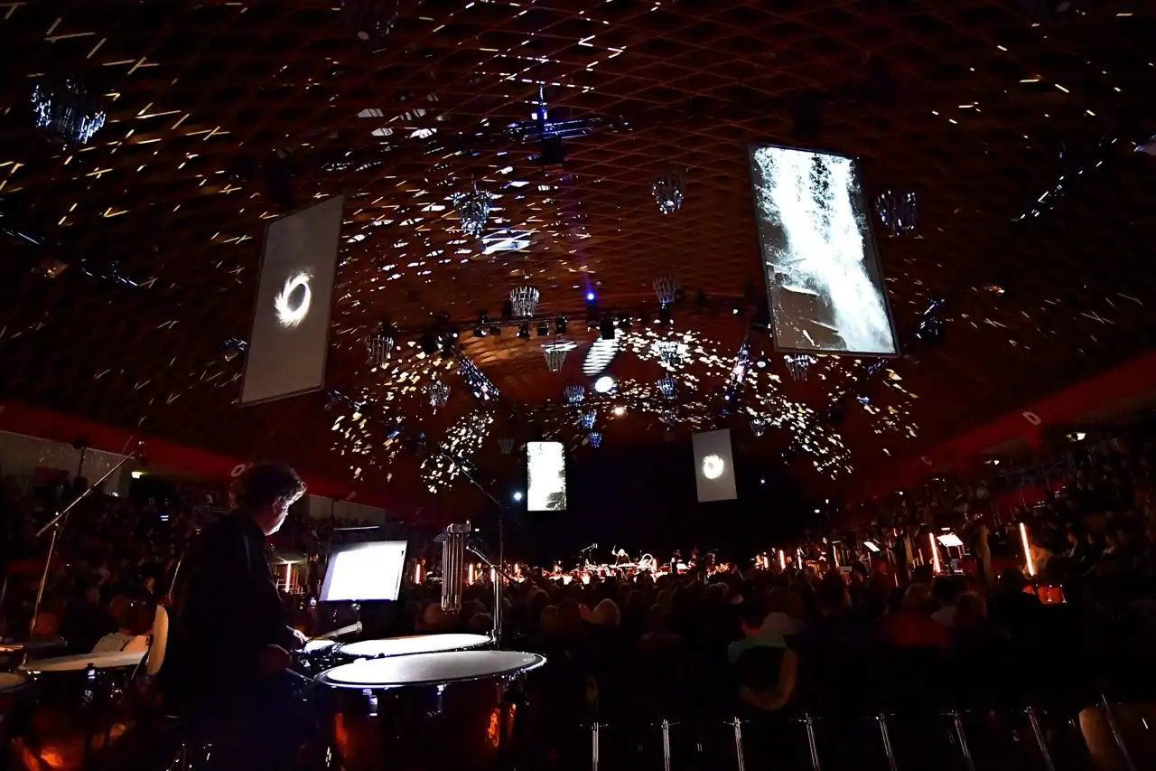 Yannick Paget and his ensemble present a new version of Fundamental Interaction — a symphonic performance featuring a spatialized orchestra of 60 musicians, electronics, four large screens, live video creation, and immersive 3D sound.
