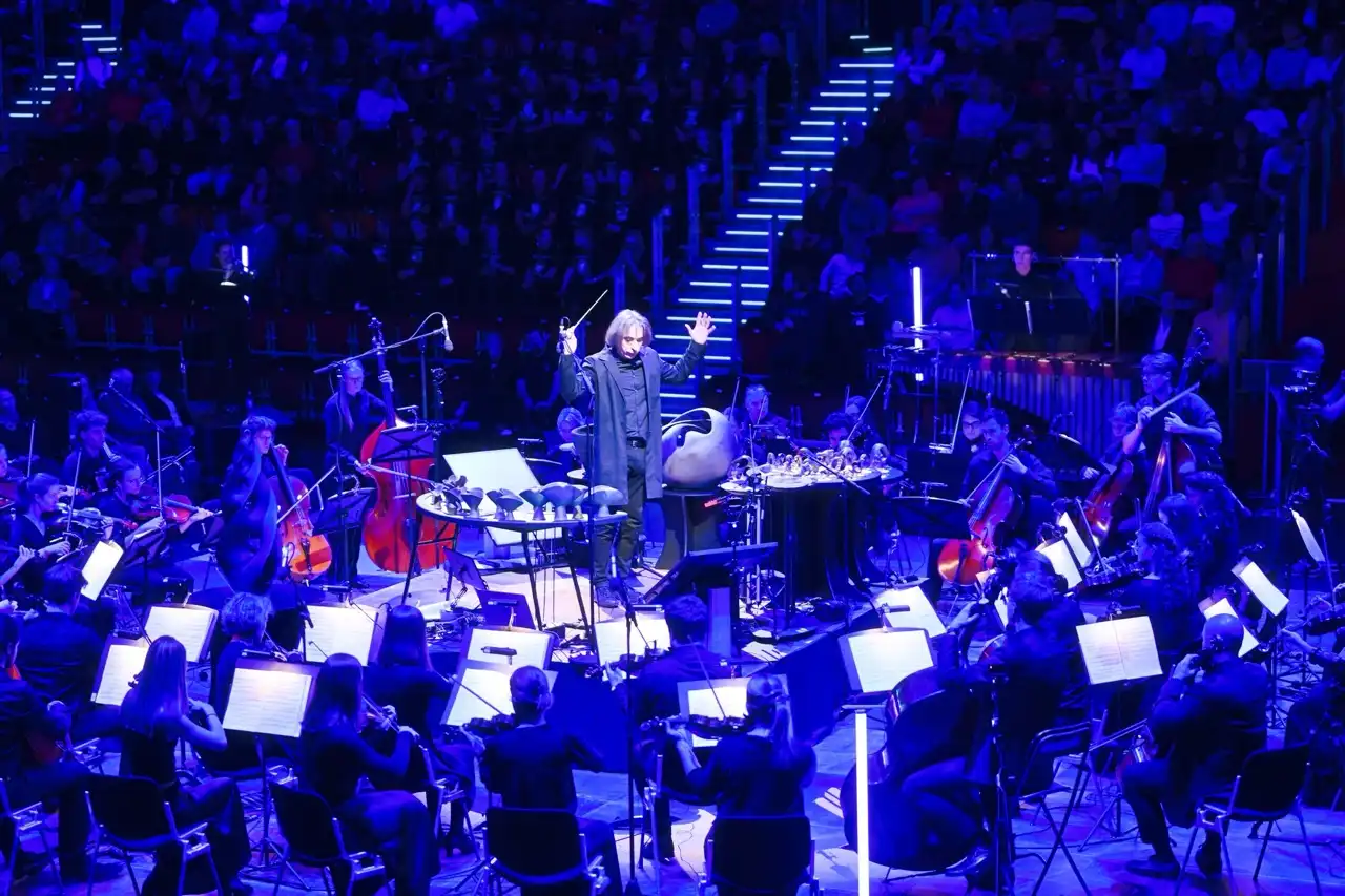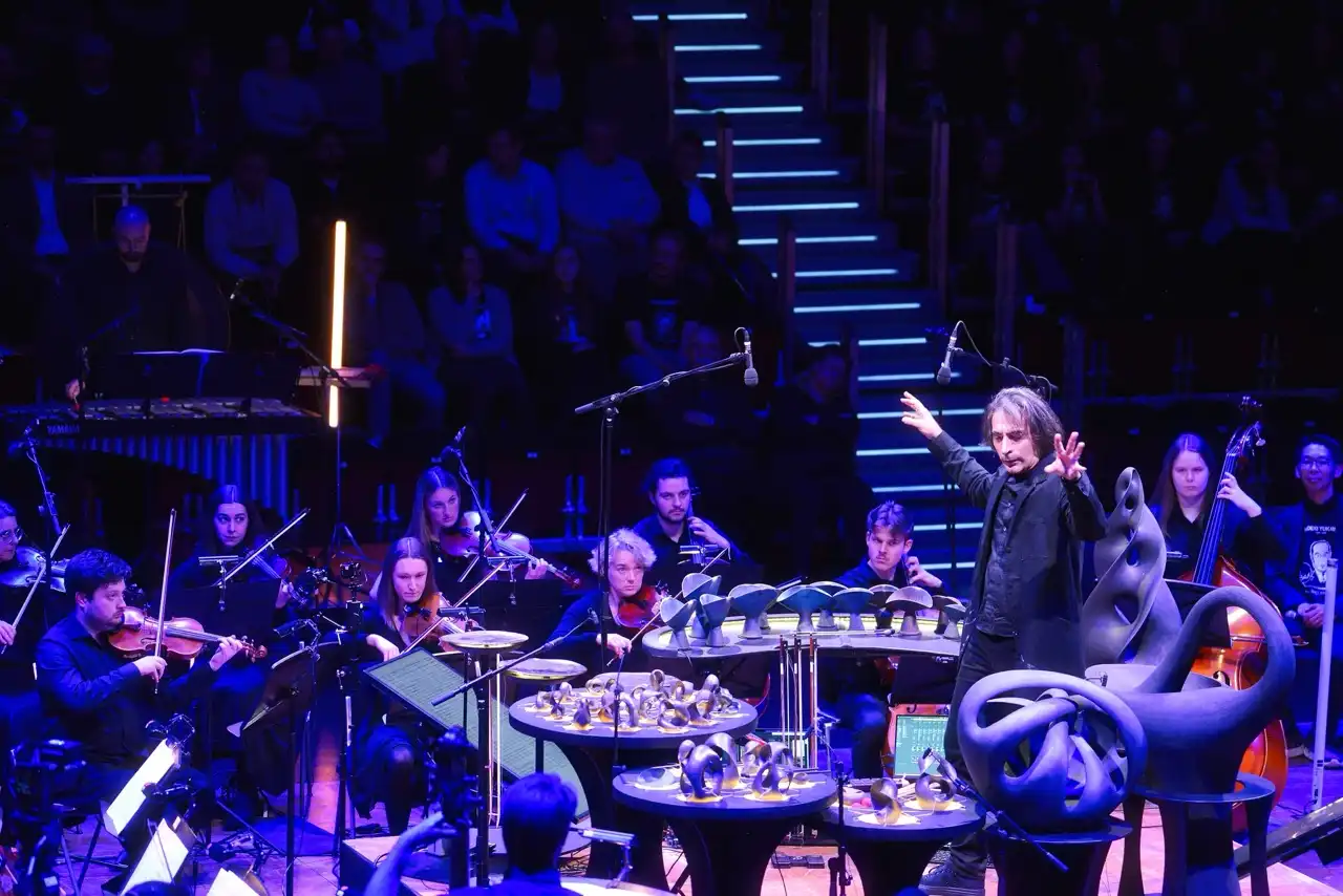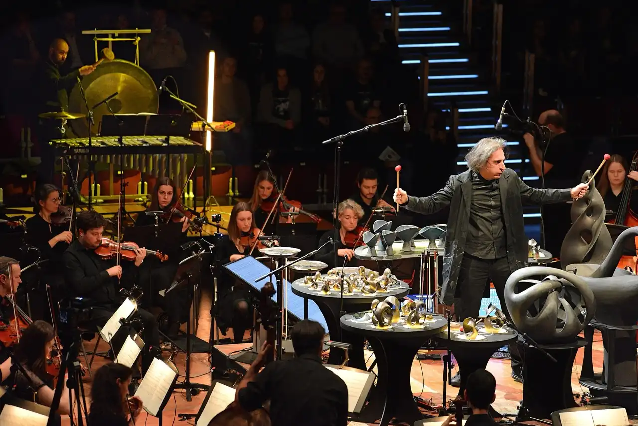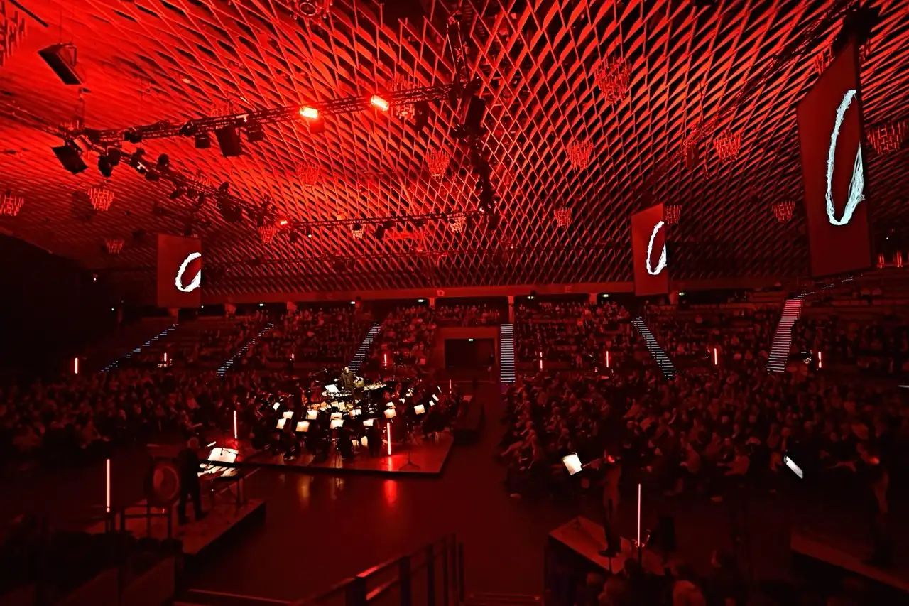 Yannick Paget and his ensemble present a new version of Fundamental Interaction — a symphonic performance featuring a spatialized orchestra of 60 musicians, electronics, four large screens, live video creation, and immersive 3D sound.